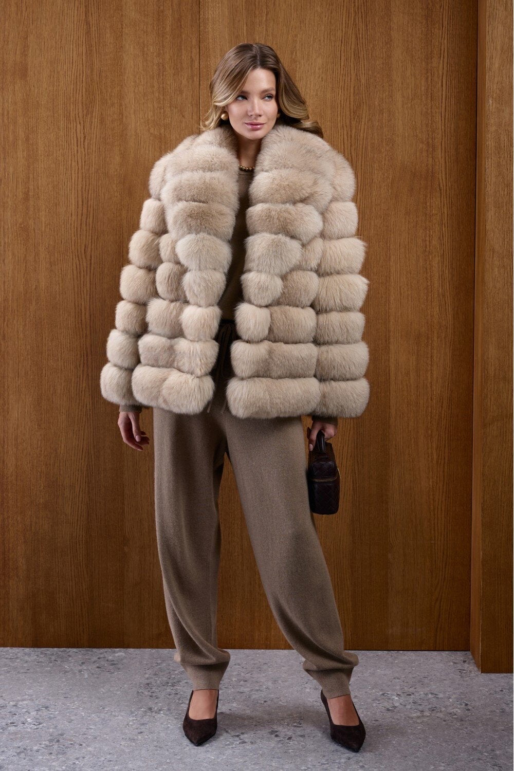 A woman exudes regal sophistication in a radiant Crossed Fox Fur coat, crafted for harsh winter weather and maximum comfort.