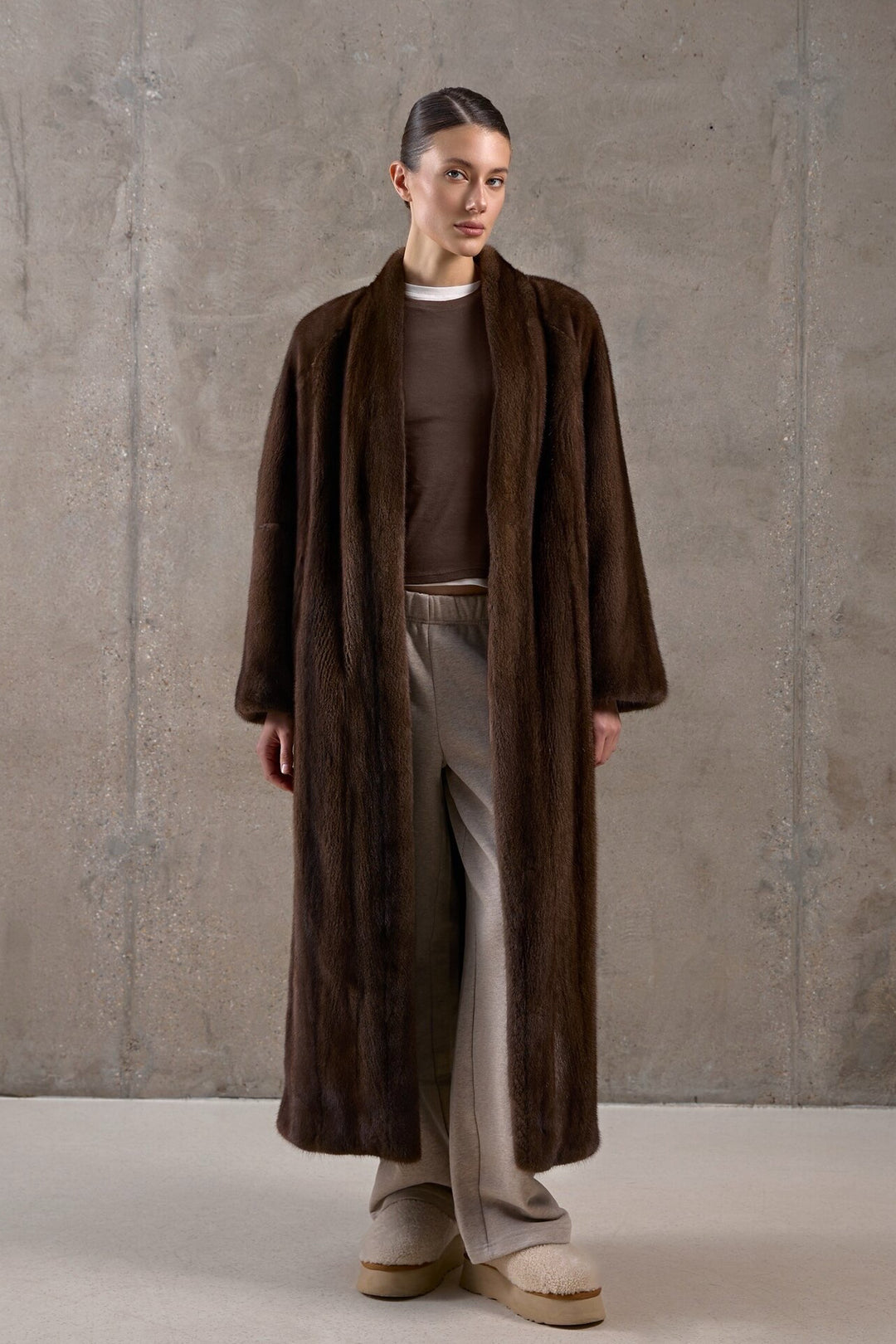 A woman wears a full-length dark brown mink fur coat, radiating elegance and warmth with its rich, velvety texture.