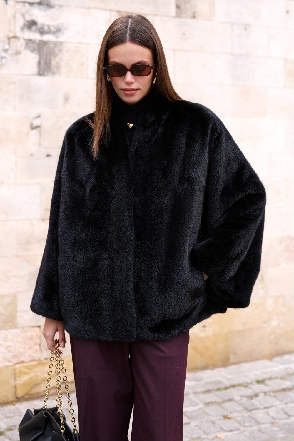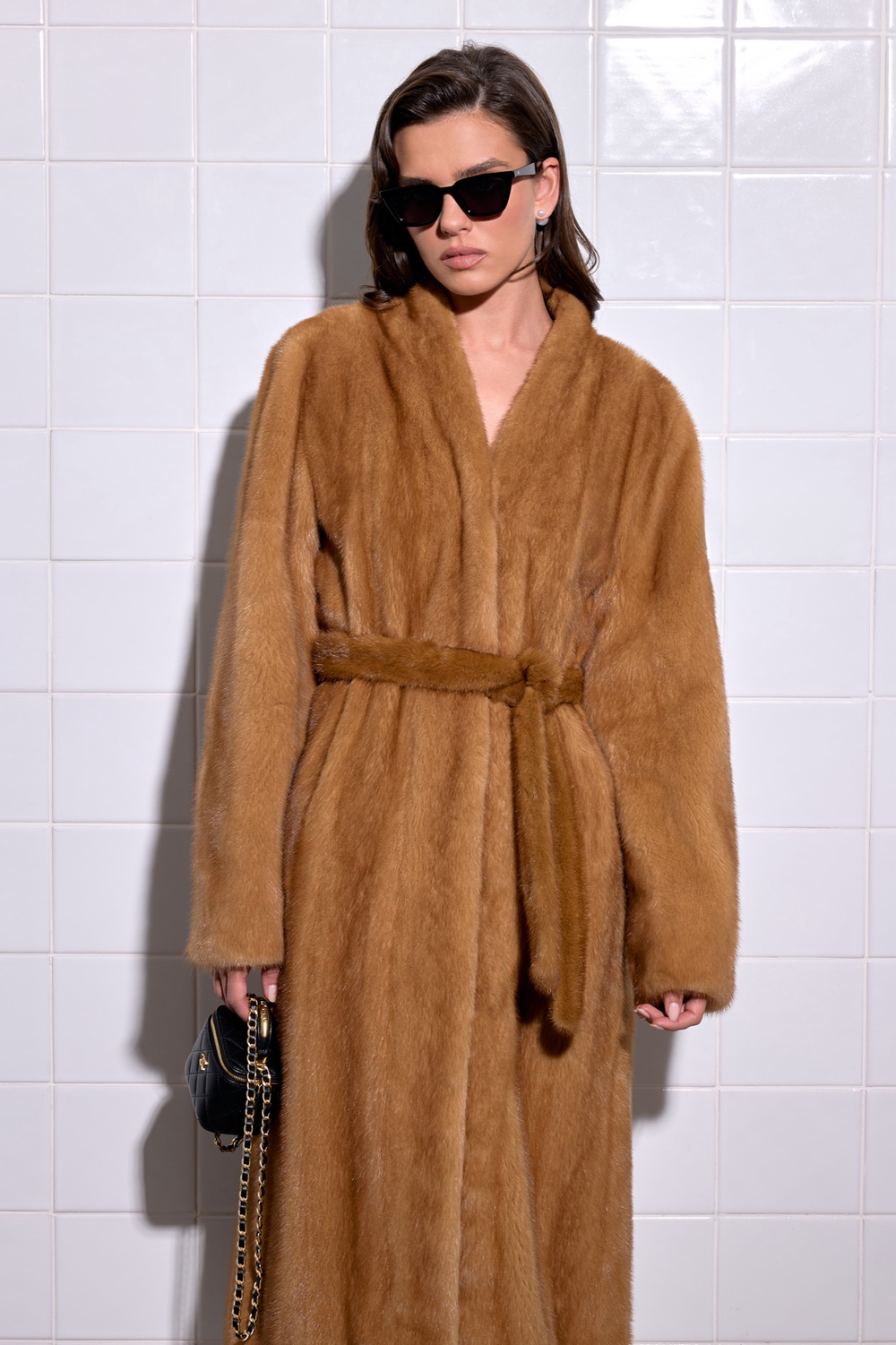 Model in a stylish brown mink fur coat with a short design, paired with denim and vintage-inspired sunglasses.