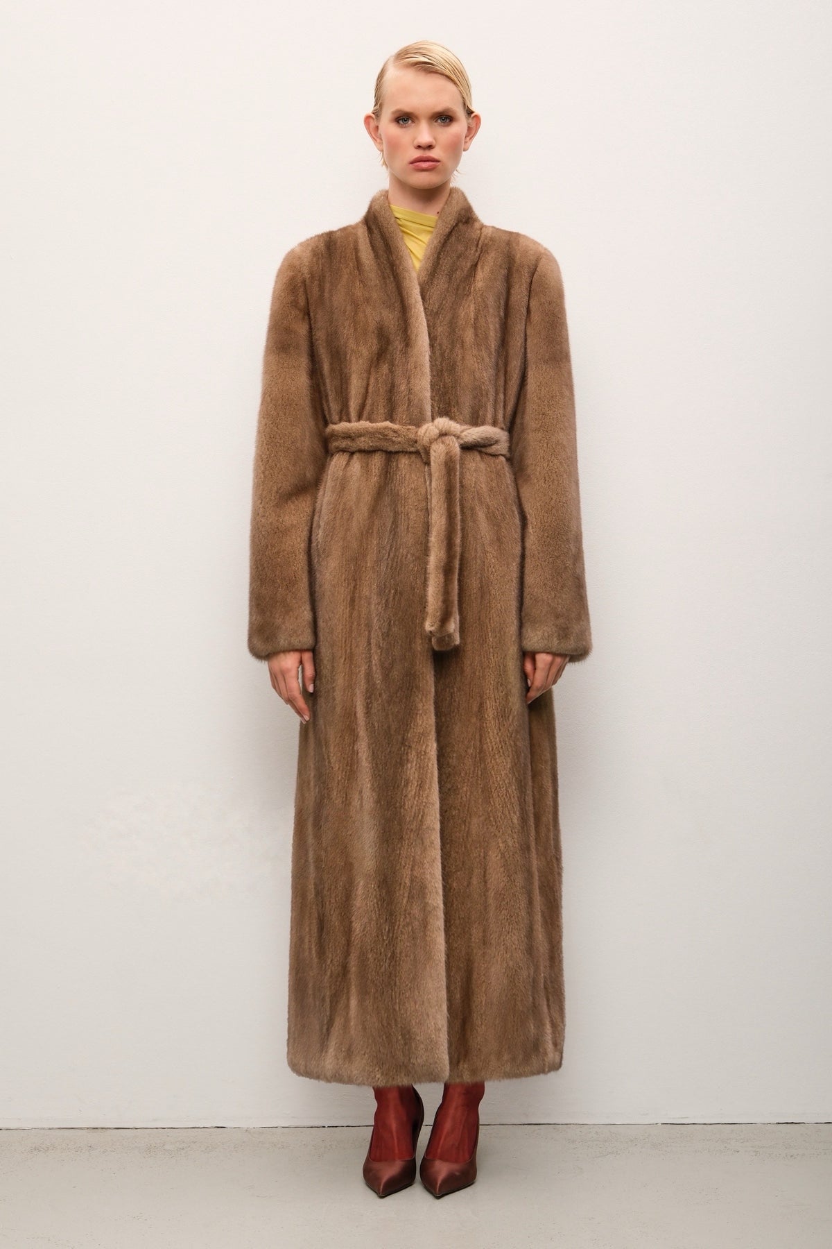 Hüllen Sie sich in Opulenz mit diesem langen braunen Nerzmantel, ein wahrer Ausdruck zeitloser Luxus. Fachmännisch gefertigt aus dem feinsten echten Nerzpelz, verstärkt sein satter Farbton den natürlichen Glanz und die unvergleichliche Weichheit des Mantels. Die bodenlange Silhouette fällt elegant und bietet sowohl außergewöhnliche Wärme als auch raffinierte Eleganz.