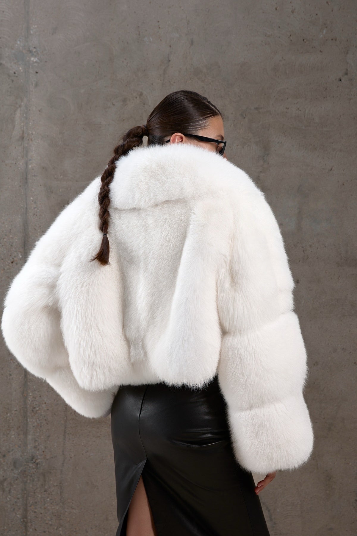 Command attention with this sculptural white artic fox fur coat — a bold expression of timeless glamour. Rich in texture and dimension making it a standout layer for evening elegance or high-profile occasions. Expertly tailored with voluminous shoulders and a cropped silhouette, this piece offers both warmth and modern allure.