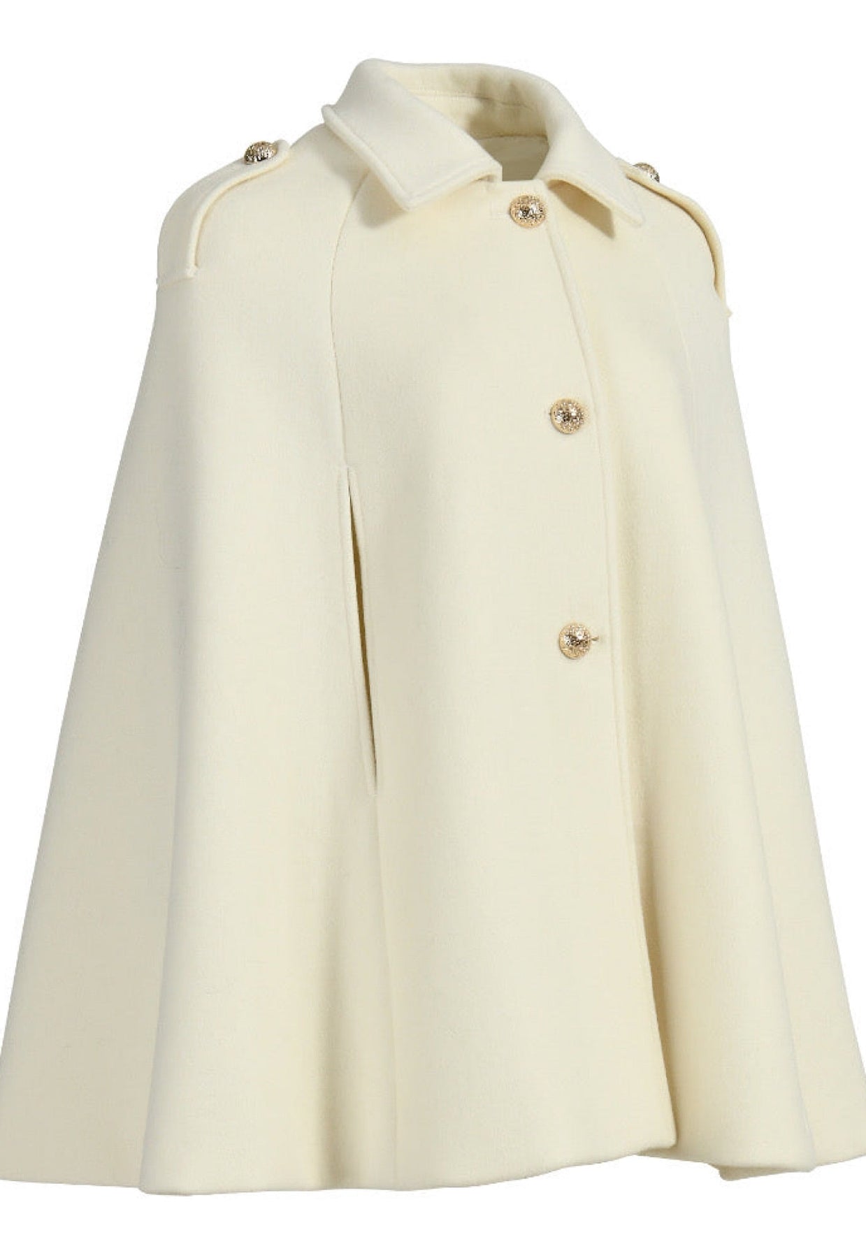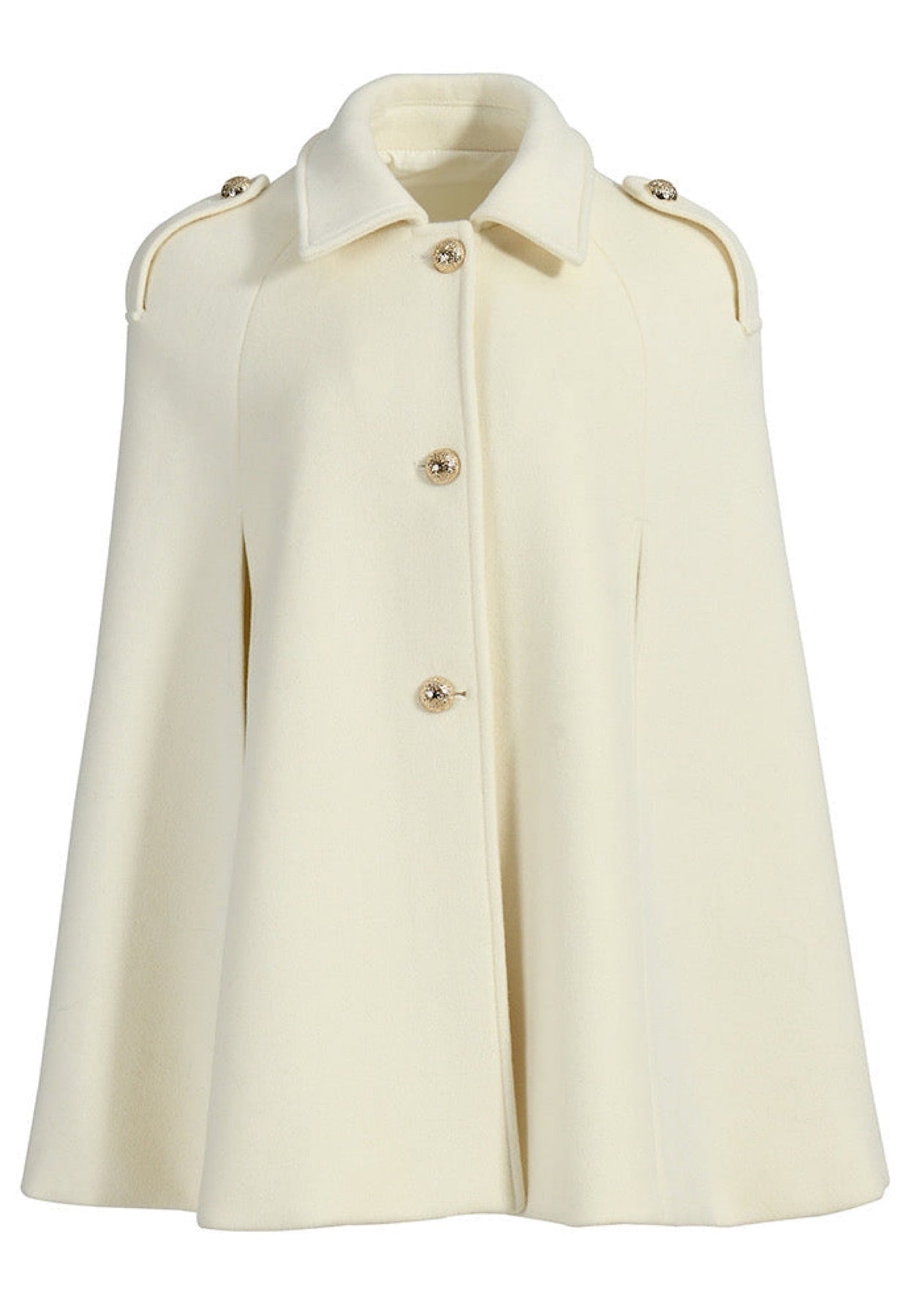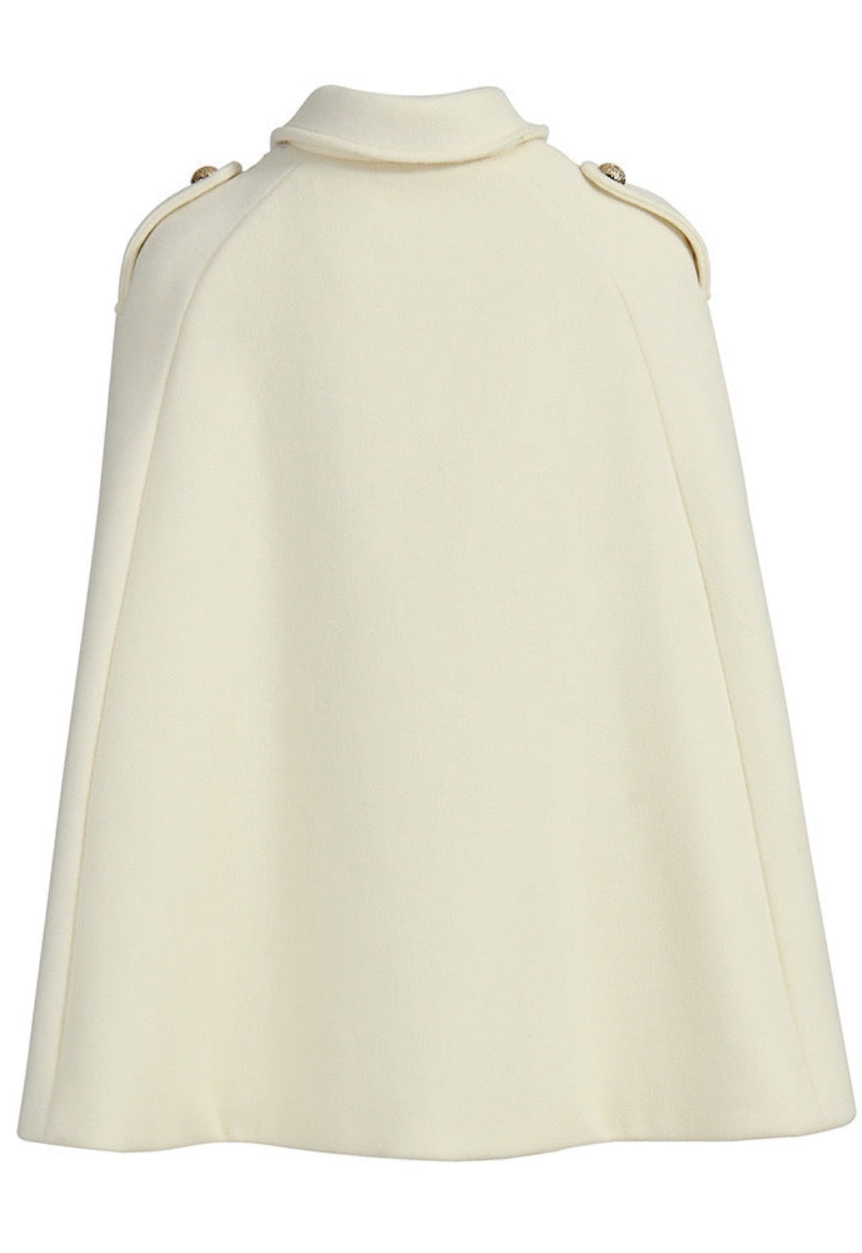 Der Caterina doppelseitige off-white Kaschmir-Cape hat einen stilvollen und schicken Schnitt, ideal zum Überwerfen über Ihren Lieblingslook. Lockerer Sitz und strukturierte Schulterklappen-Details, abgerundet mit einem eleganten Kragen. Die charakteristischen goldenen Knöpfe runden das Design ab.