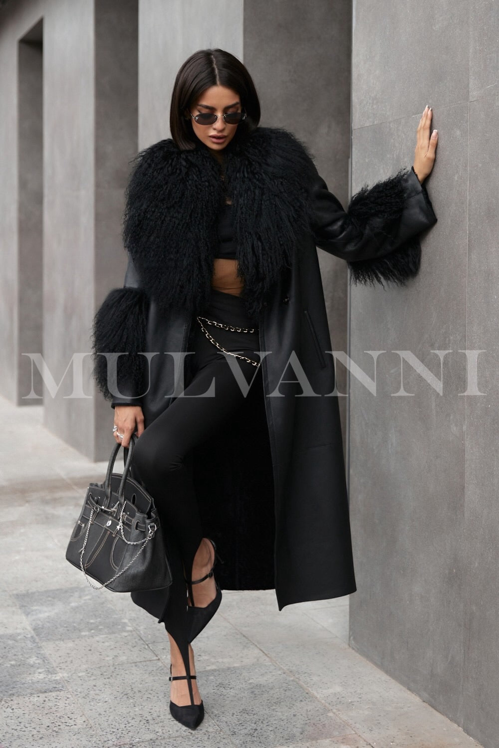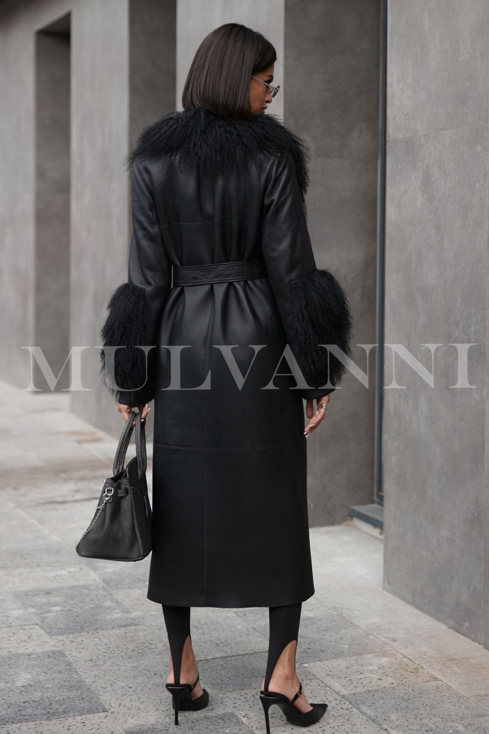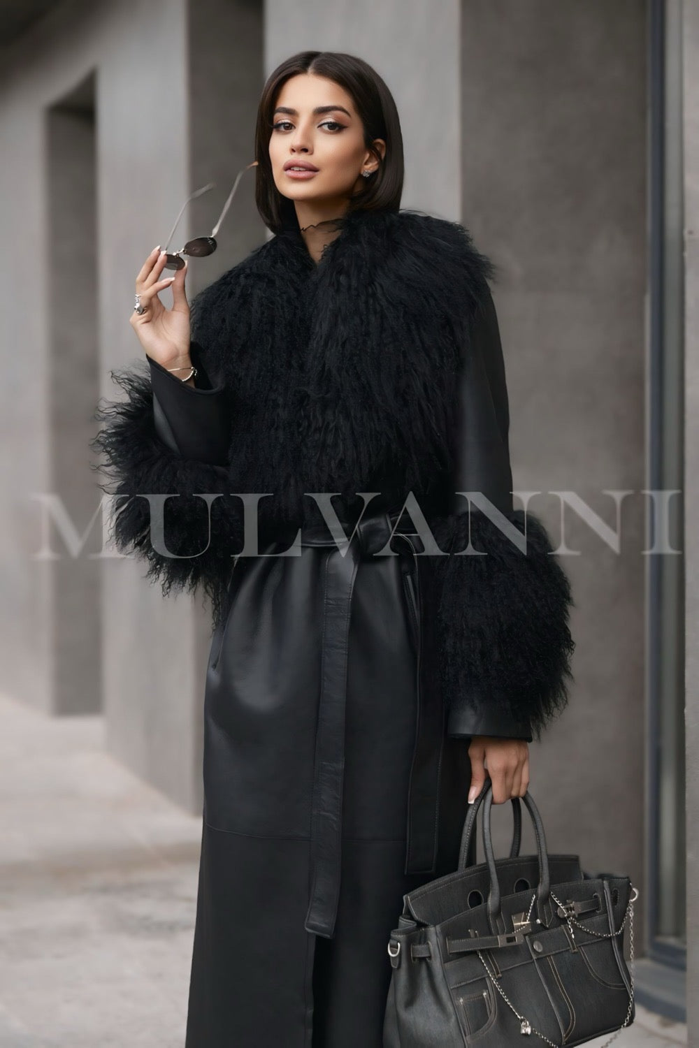 A woman wearing a chic black leather trench coat, enhanced by Mongolian fur detailing on the collar and cuffs. The coat's sleek design and warm materials offer both elegance and comfort for cold seasons.