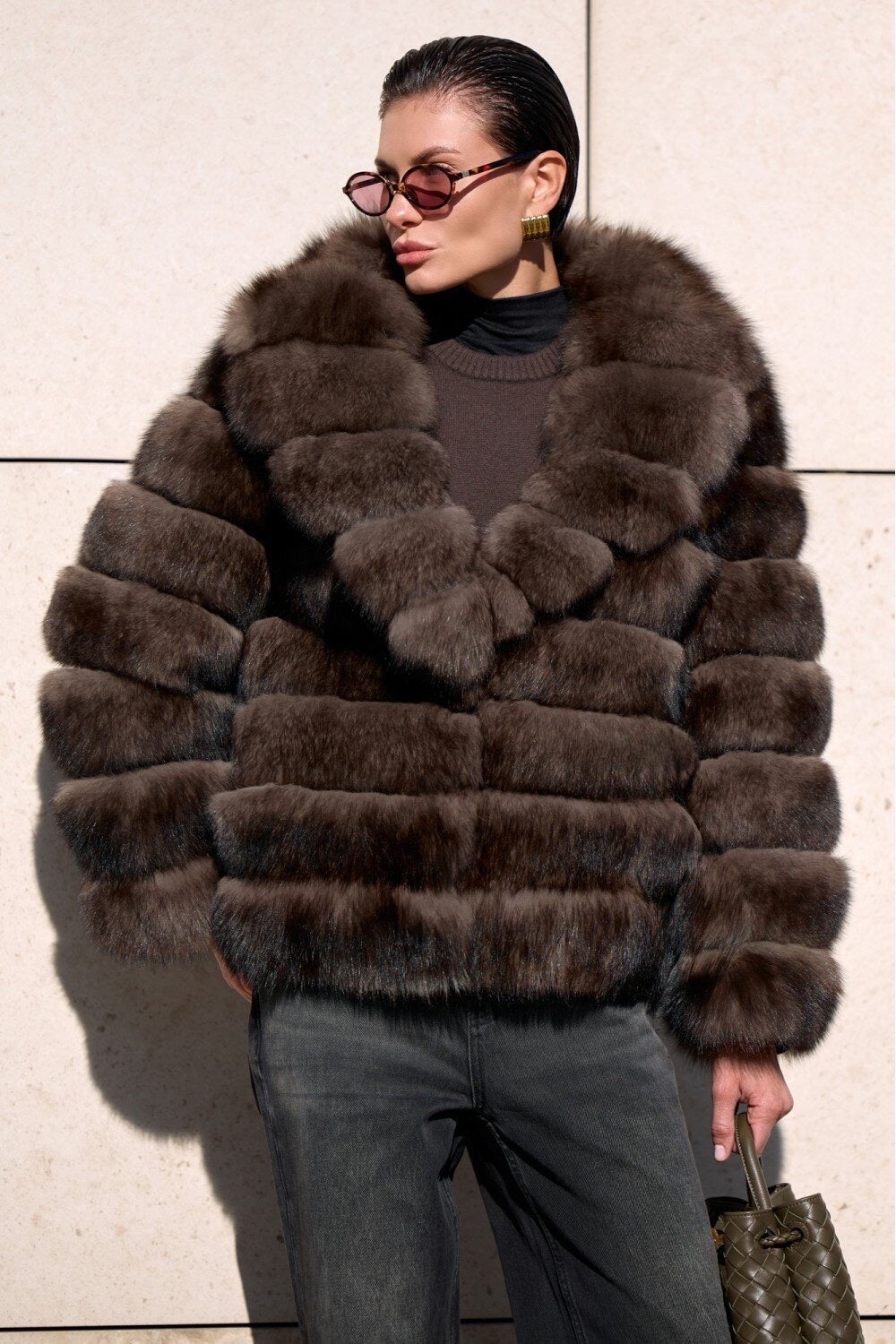 This luxurious piece features plush, voluminous panels of high-grade fox fur, arranged in a striking horizontal pattern to create a rich, sculptural silhouette. The natural sheen and fullness of the fur provide both incredible warmth and a stunning visual appeal, perfect for high-end winter dressing. A hidden front closure ensures a seamless look, while the satin lining adds a smooth, refined touch against the skin.